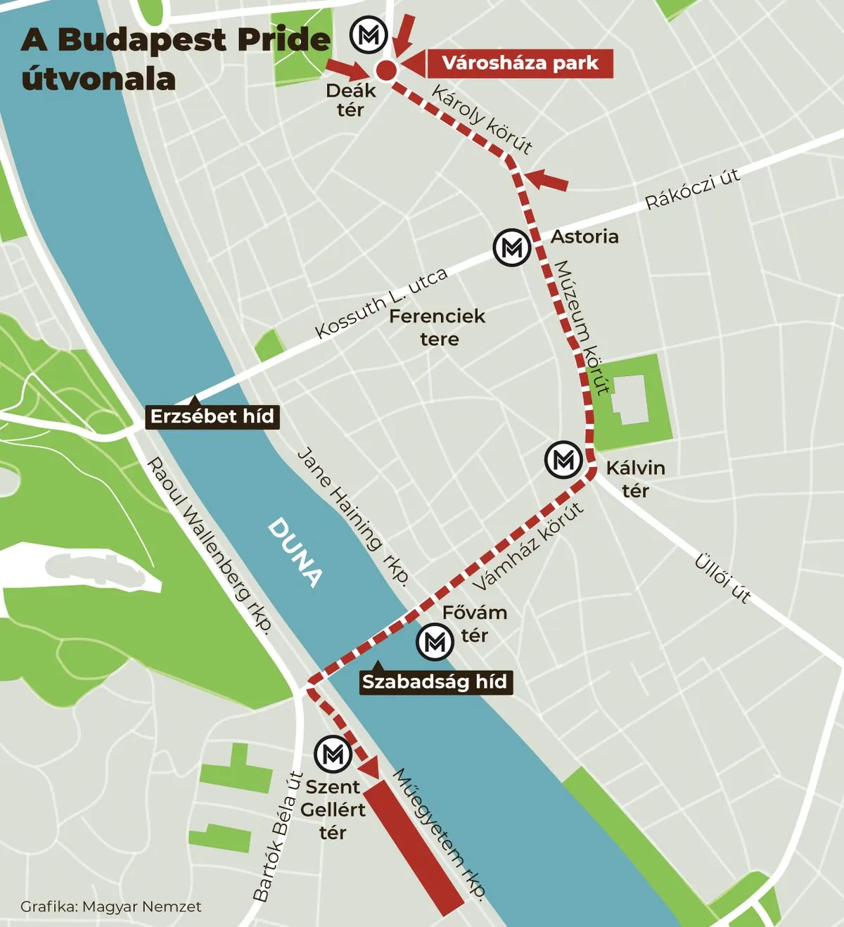 Délután 2 órára a BKK már megszüntette a közlekedést a hídon, a villamos már nem jár a Deák és a Gellért tér között. A HVIM tagjai már megérkeztek a helyszínre, de folyamatosan érkeznek a Mi Hazánk szimpatizánsai is. A Pride résztvevőit zászlókkal és „Stop LMBTQP” molinóval várják.